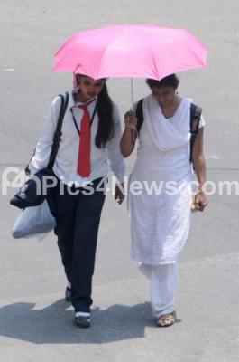 Photo Caption : College students cover their head to protect from the heat during summer, in Bengaluru on Tuesday 31st March 2015