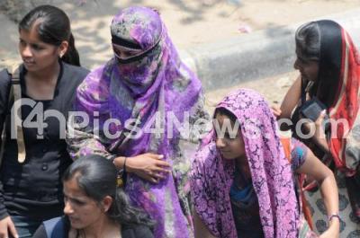 Photo Caption : College students cover their head to protect from the heat during summer, in Bengaluru on Tuesday 31st March 2015