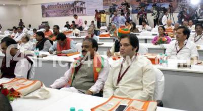Photo Caption : Varun Gandhi, BJP leader is seen with BJP Union Ministers and National leaders during inauguration of 2 day BJP National Executive meeting at Hotel Lalit Ashok, in Bengaluru on Friday 3rd April 2015
