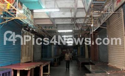Photo Caption : The usually busy and congested K R Market which sees a beehive of activities throughout the day with traders buyers , sellers and consumers for buying vegetables, fruits , Green leaves, flowers and pooja articles daily (24x7) rubbing the shoulders wrong ways wore a deserted look, as few takers are visible as the members of the All Traders of K R Market Merchants Welfare Association called for a day long bandh, as traders and footpath vendors too supported the bandh as BBMP personnel demolished an Illegal shop at K R Market ,, in Bengaluru on Tuesday 7th April 2015 Pics: www.pics4news.com