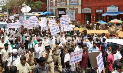 Police controlling the Members of the All Traders of S K R Market Merchants Welfare Association called for a day long bandh, as traders and footpath vendors too supported the bandh as BBMP personnel demolished an Illegal shop at K R Market ,, in Bengaluru on Tuesday 7th April 2015 Pics: www.pics4news.com