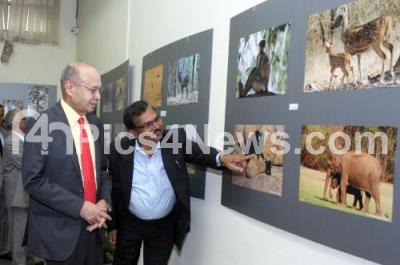 Photo Caption : Justice Lokayuktha Dr Y Bhaskar Rao looking at some of the photographs at the photography exhibition of D Palakshaiah, DYSP at Chitra Kala Parishat, also seen Sonia Narang, DCP, in Bengaluru on Friday 10th April 2015