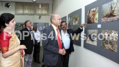 Justice Lokayuktha Dr Y Bhaskar Rao looking at some of the photographs at the photography exhibition of D Palakshaiah, DYSP at Chitra Kala Parishat, also seen Sonia Narang, DCP, in Bengaluru on Friday 10th April 2015