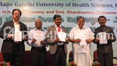 Event Description : Dr BT Rudresh, President Karnataka Homeopathy Board with Dr HR Nagendra, Vice Chancellor, Sri Vivekananda Yoga University and Dr KS Ravindranath, Vice Chancellor, Rajiv Gandhi Health University at the "World Homeopathy Day" and paid their tribute to the founder and father of Homeopathy Dr Friedrich Samuel Hahnemann on his 260th birthday, at Rajiv Gandhi University, in Bengaluru on Friday 10th April 2015