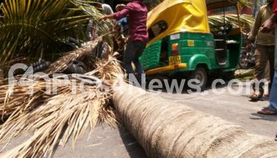 A dry coconut tree uprooted in BTM Layout, damaging an Autorickshaw and a cart, in Bengaluru on Saturday 11th April 2015