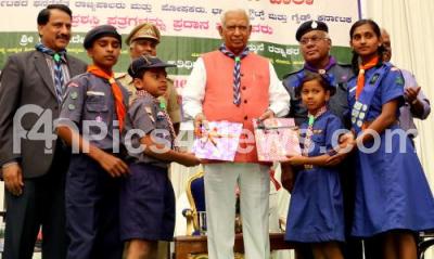Photo Caption : Governor Vajubhai Rudhabhai Vala presented the Chaturtha Charan, Heerakpankh, Rajyapuraskar to scouts and guides at Rajbhavan, organized by The Bharath Scouts and Guides Karnataka, in Bengaluru on Thursday 16th April 2015