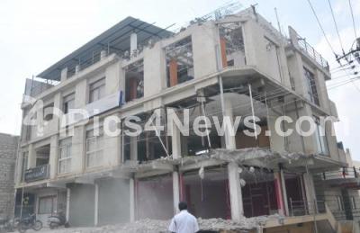 Photo Caption : Demolition drive at Sarakki lake bed by high court order, in one of the biggest operation many unauthorized houses, schools, apartments, ashrams and temples were raised to ground, in Bengaluru on Monday 20th April 2015