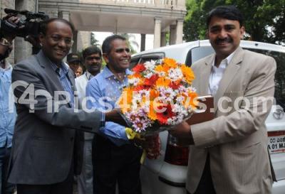 Photo Caption : Outgoing BBMP Commissioner Lakshminarayana welcoming the newly appointed BBMP Commissioner and administrator, Kumar Naik, IAS, at BBMP, in Bengaluru on Monday 20th April 2015