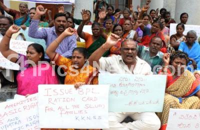 Event Description : Members of Karnataka State Slum Dwellers Federation staged a protest for issuing BPL cards to the families residing in the slums, the protest was held Town Hall, in Bengaluru on Wednesday 22nd April 2015