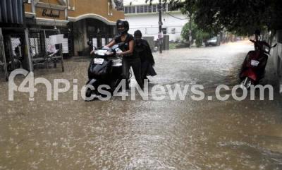 People seen passing through waves of rain water on the roads of Ejipura near Koramangala as heavy rain lashed out Bengaluru City, in Bangalore on Saturday 25th April 2015