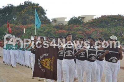 Photo Caption : Karnataka State police personnel march past at the valedictory of the Annual Sports Meet at KSRP Parade grounds, Koramangala, in Bangalore on Saturday 25th April 2015