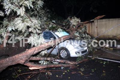 Photo Caption : A tree uprooted on the car near Police Commissioner office due to heavy rain in the city, in Bangalore on Saturday 25th April 2015