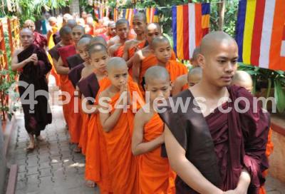 Photo Caption : Buddhist monks performing prayer on the eve of "Buddha Poornima" at Mahabodhi Society, in Bengaluru on Monday 4th May 2015