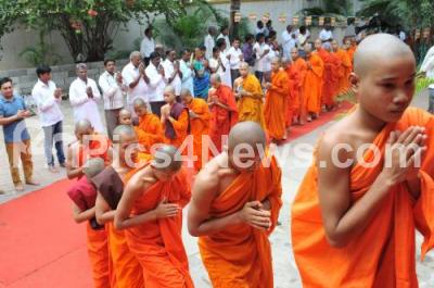 Photo Caption : Buddhist monks performing prayer on the eve of "Buddha Poornima" at Mahabodhi Society, in Bengaluru on Monday 4th May 2015