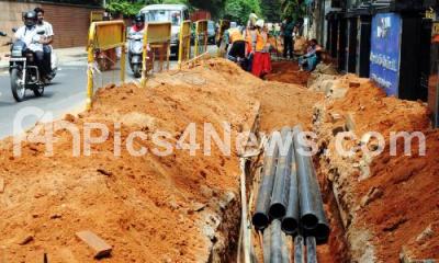 Photo Caption : Pipe line work progress at the busy Cunningham road causing a lot of problems to commuters, in Bengaluru on Wednesday 6th May 2015