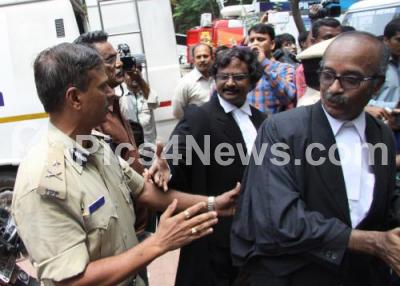 Photo Caption : Alok Kumar, Bangalore City Additional Commissioner of police controlling the crowd and lawyers gathered outside the Karnataka high court premises, after the verdict went in favor of Jayalalithaa, in Bengaluru on Monday 11th May 2015