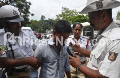 Photo Caption : Traffic police caught a guy riding a bike with high alcohol content in the early morning near double road during their routine check, in Bengaluru on Thursday 14th May 2015