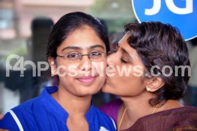 Photo Caption : Veena S Reddy , Commerce topper in 2nd PUC, from Jain College,Jayanagar being hugged by her parents, as the 2nd PUC results were announced, in Bengaluru on Monday 18th May 2015
