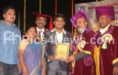 Photo Caption : Shyam Chetty, Director, CSIR, NAL with Dr Appaji Gowda, President, Rajya Vokkaligara Sangha, Dr A G Nataraj,Principal, BITS seen presenting AS Abhilash, an award for first rank holder and 7 gold medalist winner at the Bangalore Institute of Technology Graduation Day program at Kuvempu Kalakshetra, in Bengaluru on Tuesday 19th May 2015