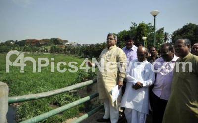 Photo Caption : KB Koliwad, Chairperson, House committee with HD Kumarswamy, Suresh Kumar, Dr Sudhakar, Gopalaiah, BDA Commissioner Shyam Bhat and other officials inspect the Kemmangundi lake at Chamrajpet during the lakes inspection drive by legislative house committee officials, in Bengaluru on Tuesday 19th May 2015