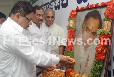 Photo Caption : Dr G Parameshwar, president KPCC with KJ George, Home Minister, paying floral homage to the portrait of Late PM Rajiv Gandhi to mark the 24th death anniversary at Congress Office, in Bengaluru on Thursday 21st May 2015