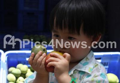 Photo Caption : A child seen enjoying eating a mango during the inauguration of the Mango and Jackfruit Mela 2015 at Lalbagh, in Bengaluru on Friday 29th May 2015