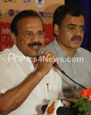 Photo Caption : DV Sadananda Gowda, Union Minister for Law and Justice with MLA Ashwathnarayana addressing a press conference on the Jobs and free skill training mela at Hotel Capitol, in Bengaluru on Friday 12th June 2015