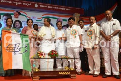 CM Siddaramaiah handed over the National Congress flag to Lakshmi Hebbalkar, who took charge as the President of Karnataka Mahila Congress in the presence of Rita Bahuguna, Prabha Thakur, Dr G Parameshwar, DK Shivakumar, Roshan Baig and others at a program at Ambedkar Bhavan, in Bengaluru on Friday 12th June 2015