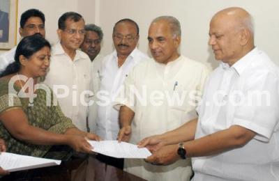 Photo Caption : SR Patil, Minister for IT and BT seen interacting with congress party workers during his visit to KPCC office, in Bengaluru on Thursday 18th June 2015