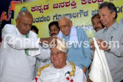 Event Description : Former PM HD Devegowda presenting "Shantaveri Gopalagowda 2015" award to Senior Journalist SV Jayasheela Rao, organized by Kannada Janashakti Kendra at Kannada Sahitya Parishat, also seen are Freedom Fighter HS Doreswamy, Dr Baraguru Ramachandrappa and others, in Bengaluru on Sunday 21st June 2015