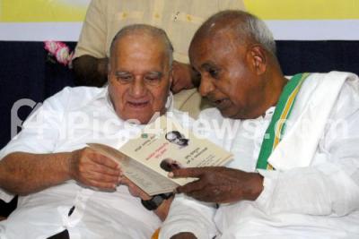 Photo Caption : Former PM HD Devegowda interacting with Senior Journalist SV Jayasheela Rao, during "Shantaveri Gopalagowda 2015" award presentation ceremony, organized by Kannada Janashakti Kendra at Kannada Sahitya Parishat, in Bengaluru on Sunday 21st June 2015