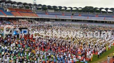 Photo Caption : People partake in International Yoga Day at Kanteerva Stadium, in Bengaluru on Sunday 21st June 2015