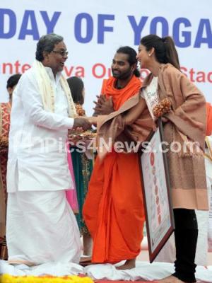 Photo Caption : CM Siddramaiah with Bollywood Actress Shilpa Shetty partake in International Yoga Day at Kanteerva Stadium, in Bengaluru on Sunday 21st June 2015