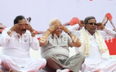 Photo Caption : CM Siddramaiah with Home Minister KJ George and Minister RV Deshpandey partake in International Yoga Day at Kanteerava Stadium , in Bengaluru on Sunday 21st June 2015