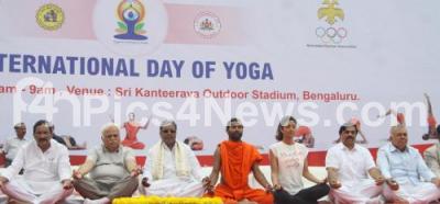 Photo Caption : CM Siddramaiah with Home Minister KJ George and Minister RV Deshpande, Shilpa Shetty partake in International Yoga Day at Kanteerava Stadium, in Bengaluru on Sunday 21st June 2015