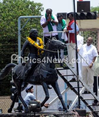 Photo Caption : HD Kumarswamy, JDS leader with supporters seen arriving for garlanding the statue of Kittur Rani Chennamma before heading to the Assembly Session at Suvarna Soudha, in Belagavi on Monday 29th June 2015
