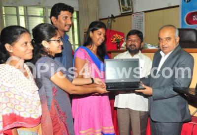 Photo Caption : Dr Siddalingaiah with Prof B Thimme Gowda seen distributing laptops to SC ST students at a program at Bangalore University, in Bengaluru on Monday 29th June 2015