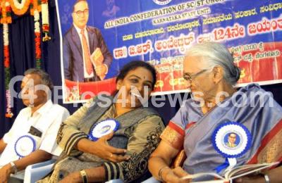 Photo Caption : Former Minister BT Lalitha Naik with Samata Deshamane. Lecturer, Bangalore University and Purushotham Das at the 124th Jayantotsava of Dr BR Ambedkar, organized by All India Confederation of SC/ST organizations at Jai Bheem Bhavan, in Bangalore on Sunday 5th July 2015