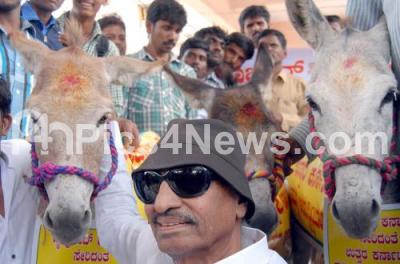 Photo Caption : Members of Kannada Chaluvali Vatal Paksha led by its President Vatal Nagaraj protesting and demanding Hyderabad Karnataka developments, the protest held at Kempegowda Bus Stand, in Bangalore on Sunday 5th July 2015