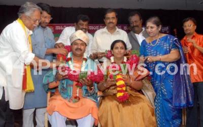 Photo Caption : Hindustani vocalist Ravindra Sorangavi being felicitated by Dr Doddarangegowda at Nayana, also seen are MS Murthy, Dr Manu Baligar and others, in Bangalore on Sunday 5th July 2015