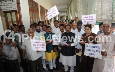 Photo Caption : MLCs KS Eshwarappa with Tara and others seen protesting outside the chamber of Minister UT Khader at Suvarna Soudha, in Belagavi on Thursday 9th July 2015