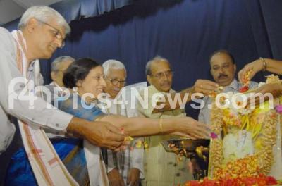 Photo Caption : Meer Achar with Dr Ravishankara Adiga, SN Panchanje, President, Karnataka Samskrutika Kala Pratistana and others offering floral tribute to late K Suryanarayana Adigas portrait during his birth anniversary at Kannada Sahitya Parishat, in Bangalore on Sunday 19th July 2015