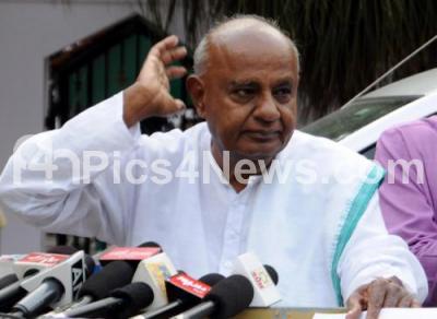 Former Prime Minister HD Deve Gowda addressing a press conference after meeting Governor Vajubhai Rudabhai Vala to discuss on various issues at Raj Bhavan, in Bengaluru on Friday 24th July 2015