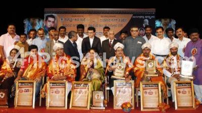 Photo Caption : Justice Subhash B Adi and Justice M N Venkatachalaiah, M K Panduranga Shetty, K A Dayanand, Hemachandra Sagar and others presented Sagar Awards to Srinath, Geetha Srinath, Tejaswini Ananthakumar, Ramesh Bhatt, Arjun Devaiah, V S Murthy, H R Nagarajacharya and S Krishnamurthy during the Rangothsava 2015 Cultural Fest, organised by Rangasree Kalaa Samsthe, Dayananda Sagar Prathisthaana and Dept of Kannada and Culture at Ravindra Kalakshetra, in Bengaluru on Friday 24th July 2015