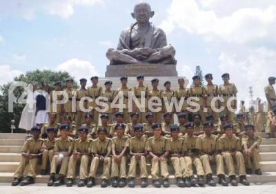 Photo Caption : Newly raised platoon of Students Police Cadets were taken round the Vidhan Soudha and got themselves clicked in front of Mahatma Gandhi Statue at Vidhan Soudha, in Bengaluru on Saturday 1st August 2015 Pics: www.pics4news.com