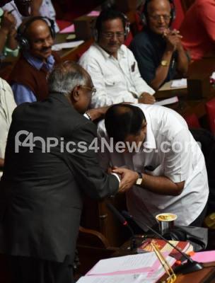 Photo Caption : Council Chairman DH Shankar Murthy greeting JDS MLC Marithibbe Gowda, elected as Deputy Chairman to the Karnataka Legislative Council during Council Session at Vidhan Soudha, in Bengaluru on Saturday 1st August 2015