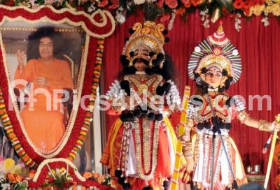 Photo Caption : Yakshagana artistries performing during "Sri Sathya Sai Premamrutham" program organized by Sri Sathya Sai Seva Organizations, Karnataka at Malleshwaram, in Bangalore on Sunday 2nd August 2015