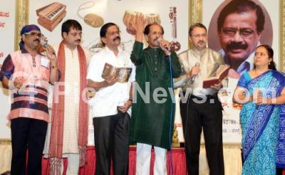 Photo Caption : Poet BR Lakshman with YK Muddukrihsna, Kikkeri Krishnamurthy and others singing during "Kaviya Nodi Kavite Keli" program organized by Karnataka Suguma Sangeeta Parishat at HN Kalakshetra, in Bangalore on Sunday 2nd August 2015