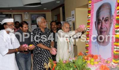 Photo Caption : Justice Dr M Rama Jois with HS Suresh, Director, BVB, Nataraj, President, Gandhi Kamaraj Memorial Trust and others offering floral tribute to Padmashree Dr Matturu Krishnamurthy portrait on the occasion of his 87th birth anniversary at Bharatiya Vidya Bhavan, in Bengaluru on Saturday 8th August 2015
