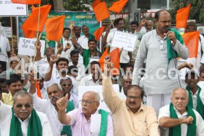 Event Description : Ranganath President Bharath Kissan Sangha Karnataka a pro farmer organization addressing the members who are sitting in dharna demanding waiver of farmers loans, and the farmers who are in distress are committing suicide daily and chalk out a plan for counseling the distress farmers from taking the extreme step of committing suicide with a charter of demands for their rehabilitation at Gandhi statue Near Ananda Rao circle, in Bangalore on Monday 10th August 2015